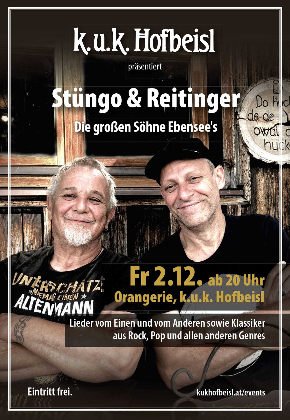 Die beiden präsentieren in einem exklusiven Abend in intimer Atmosphäre live on Stage in unserer Orangerie im k.u.k. Hofbeisl Lieder vom Einen und vom Anderen sowie Klassiker aus Rock, Pop und allen anderen Genres.