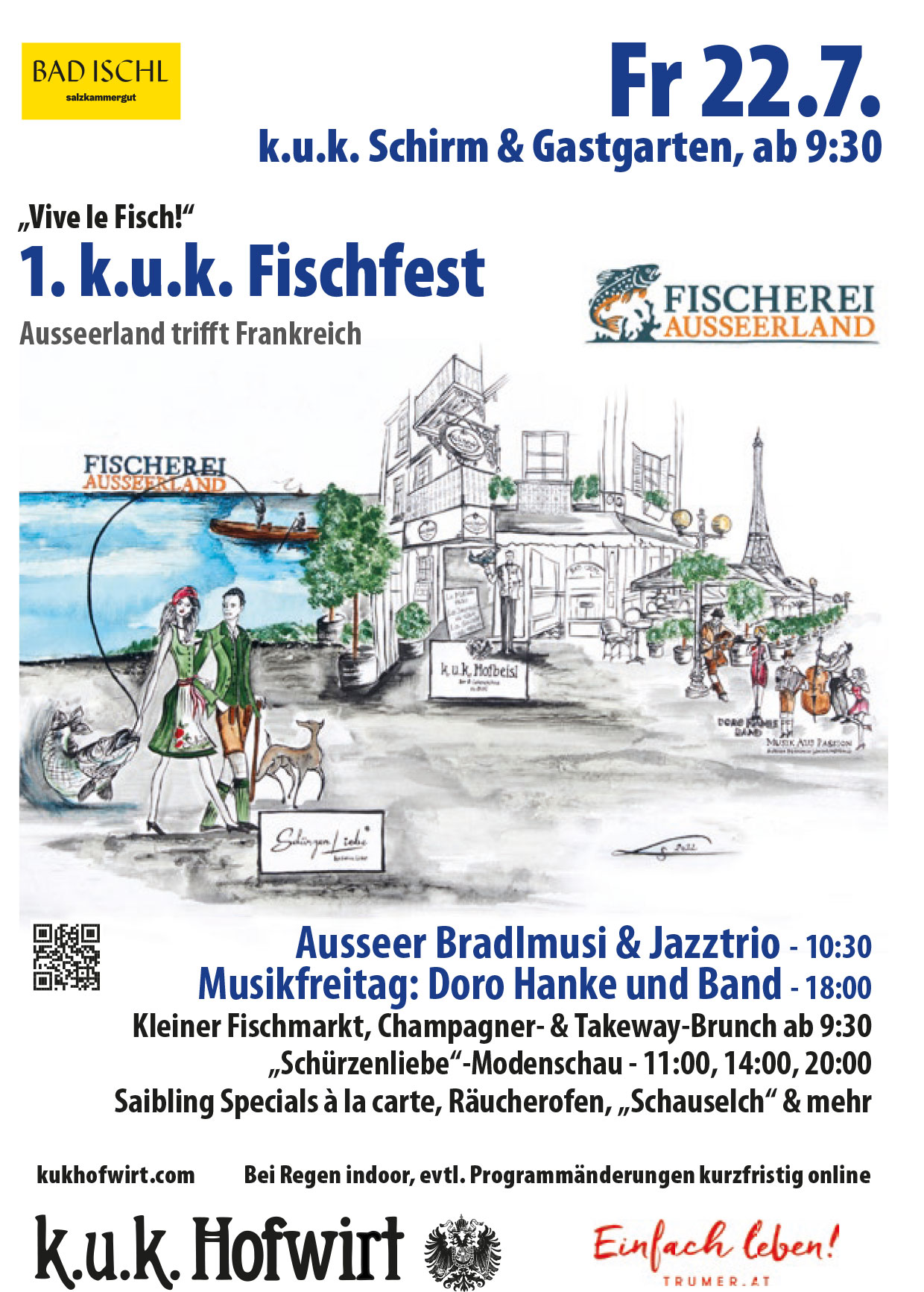 Gemeinsam mit der Fischerei Ausseerland präsentieren und servieren wir einen ganzen Tag und Abend lang das allerbeste, was unser hochgeschätzter Haus- und Hoflieferant zum Thema Fisch zu bieten hat. Was „total regional“ vor Ort gewachsen ist, bringen wir „à la française“ auf den Teller, das heißt mit dem hohen Qualitätsanspruch französischer Service- und Gastronomiekultur. Für den perfekten Genuss mit allen Sinnen wird das erste k.u.k. Fischfest von feinfühlig darauf abgestimmter Musik und Mode begleitet – und zwar mit einem nur für diesen Anlass zusammengestellten musikalischen Spezialarrangement der Ausseer Bratlmusi mit dem Ausseer Jazztrio zum Brunch ab ca 10h30, mit feinen „Chansons de swing et plaisirs de la vie“ von Doro Hanke und Band ab ca 18h im Rahmen des Ischler Musikfreitages und mit regionaler „Mode mit Geschmack“ von Schürzenliebe by Sabine Linke („Défilés de couture creative et régionale“ um 11h00, 14h00 und 20h00).