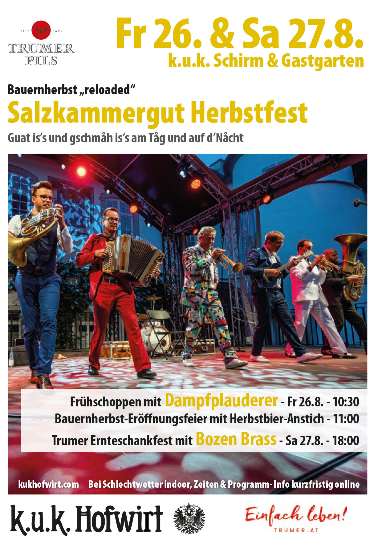 • des legendären Trumer Ernteschankfestes am Sa 27. August als Hommage an das legendäre „Trumer Herbstbier“ – und dieses Mal so legendär wie noch nie, weil niemand geringerer als das legendäre Brass Ensemble aus Südtirol „Bozen Brass“ ab ca 18 Uhr auf der k.u.k. Bühne stehen wird. Selbstverständlich gibt es auch neben dem klassischen „Trumer Pils“ das „Obertrumer Original“ als Zwickelbier vom Fass, passend zum Herbst oder das „Trumer Freispiel“, welches als alkoholfreie Bierspezialität besonders bei Autofahrern sehr beliebt ist. Tischreservierung speziell zum Abendessen ab 17h30 empfohlen!