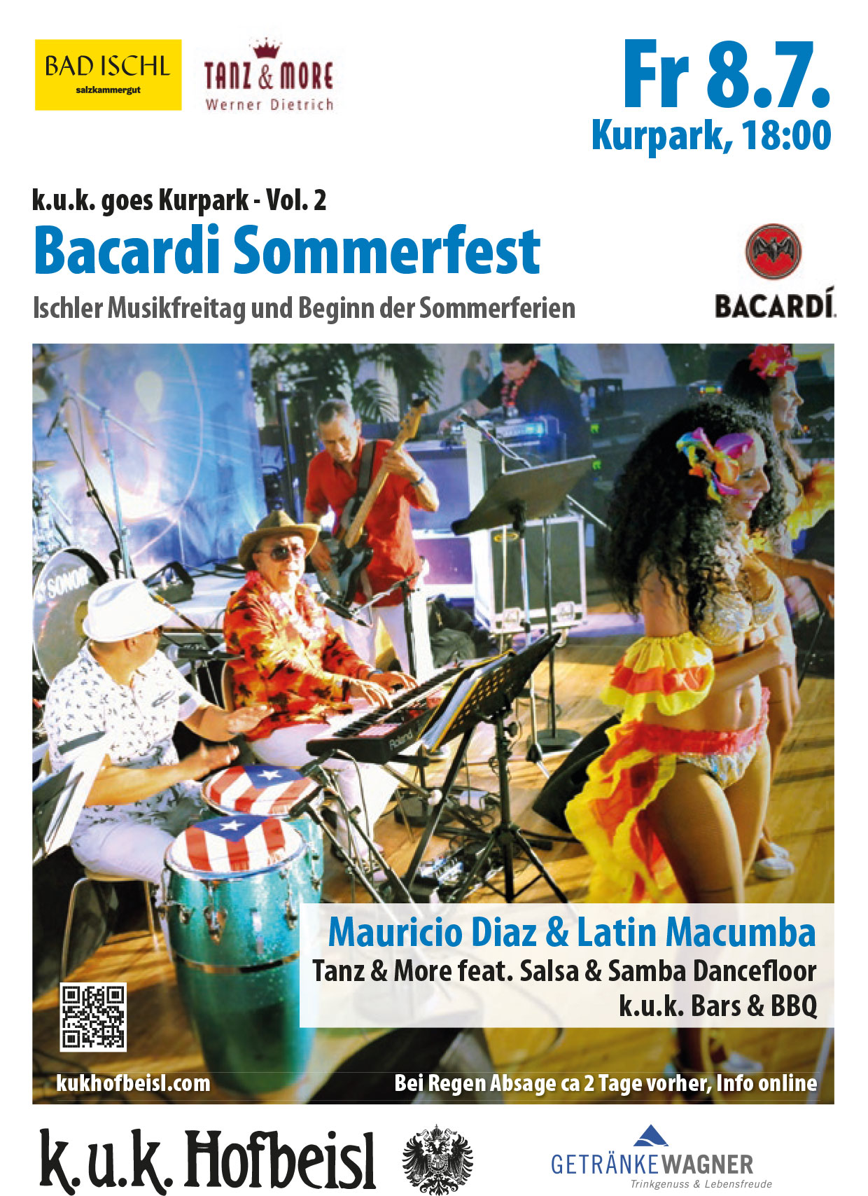 Im Hinblick auf die Wetterprognose: Die Musik wird soooo heiß und Bacardi macht sooooo viel Stimmung, dass wir trotz des frischen Lüfterls das k.u.k. Sommerfest durchziehen werden! Einfach noch mehr tanzen, noch mehr leben, noch mehr Spaß – ab in die Ferien – let’s party! See you @ Kurpark!