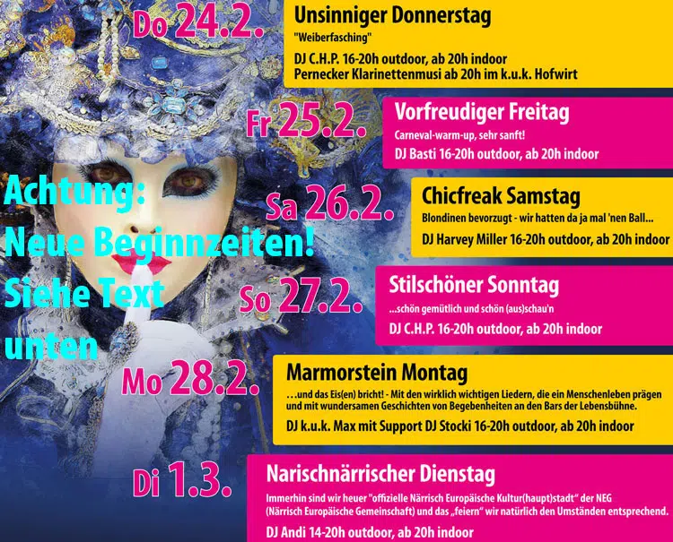 Kurzfristig mussten wir aufgrund behördlicher Bedenken unsere ursprünglich geplanten  Outdoor-Acts absagen. Indoor können wir uns gut an die Vorgaben halten, weshalb wir hier die Beginnzeiten allgemein auf 19h vorverlegt haben.