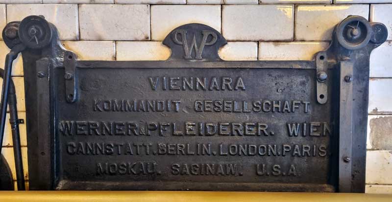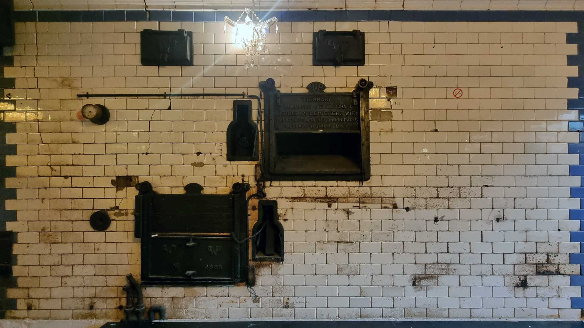 Eine ganz besondere Inspiration geht im vorliegenden Kontext von der Historie unserer Hofbeisl-Räumlichkeiten aus. Ganz hinten im k.u.k. Hofbeisl, vor dem Durchgang zum k.u.k. Hofwirt kann man eine ebenso ungewöhnliche wie originale Wand-Dekoration entdecken. Am Ort unserer Miramare-Küche befand sich nämlich früher der Backofen der Ischler Bäckereien Vogtenhuber und Nahmer.