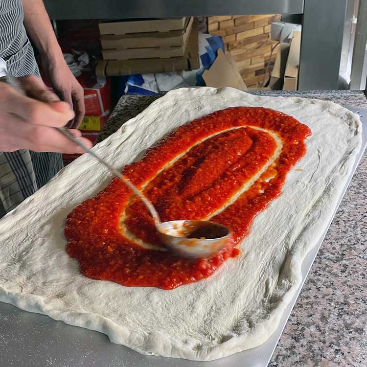 Tomatensauce, Mozzarella Fior di Latte, Nduja aus Calabrien (scharfe Salami), Oliven