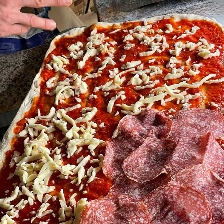 Tomatensauce, Mozzarella Fior di Latte, Salami Milano (aus Mailand)