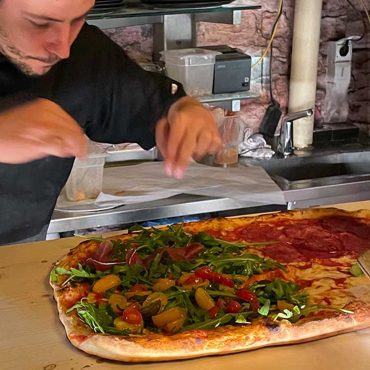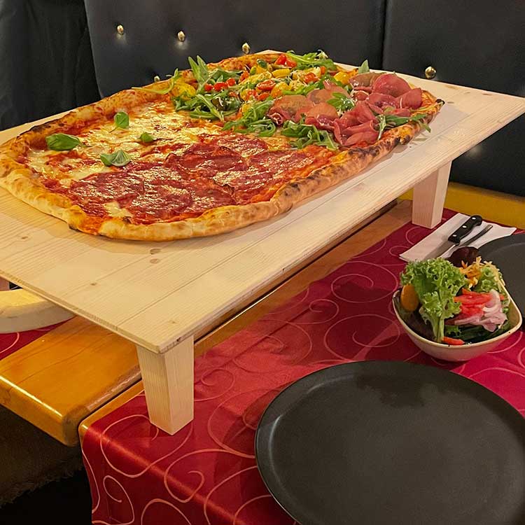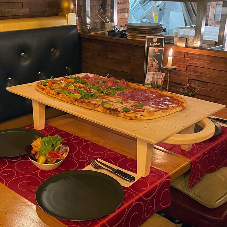 Inspiriert vom 3. Platz bei der Pizza-WM 2024 in Neapel präsentieren Maestro Alessandro und sein Osteria-Team die Miramare Kaiserpizza im XXL-Format. Für die Riesen-Pizza ganz nach eigenem Geschmack gibt es bis zu vier von 12 Pizzen zur Auswahl. Sie wird auf dem eigens konstruierten k.u.k. Holzteller-Tisch serviert und ist ideal für Tisch-Runden ab 4 Personen. Bitte vorbestellen und reservieren unter +43 6132 27271 (à la carte nur bei wenig Auslastung möglich). Viel Spaß und „buon Apetito“!